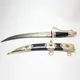 Отделка кинжала выполнена с использованием самых ценных материалов: латунь, покрытая золотом высшей пробы, дополняется роскошной инкрустацией из драгоценных камней – рубина, изумруда и бриллиантов.
